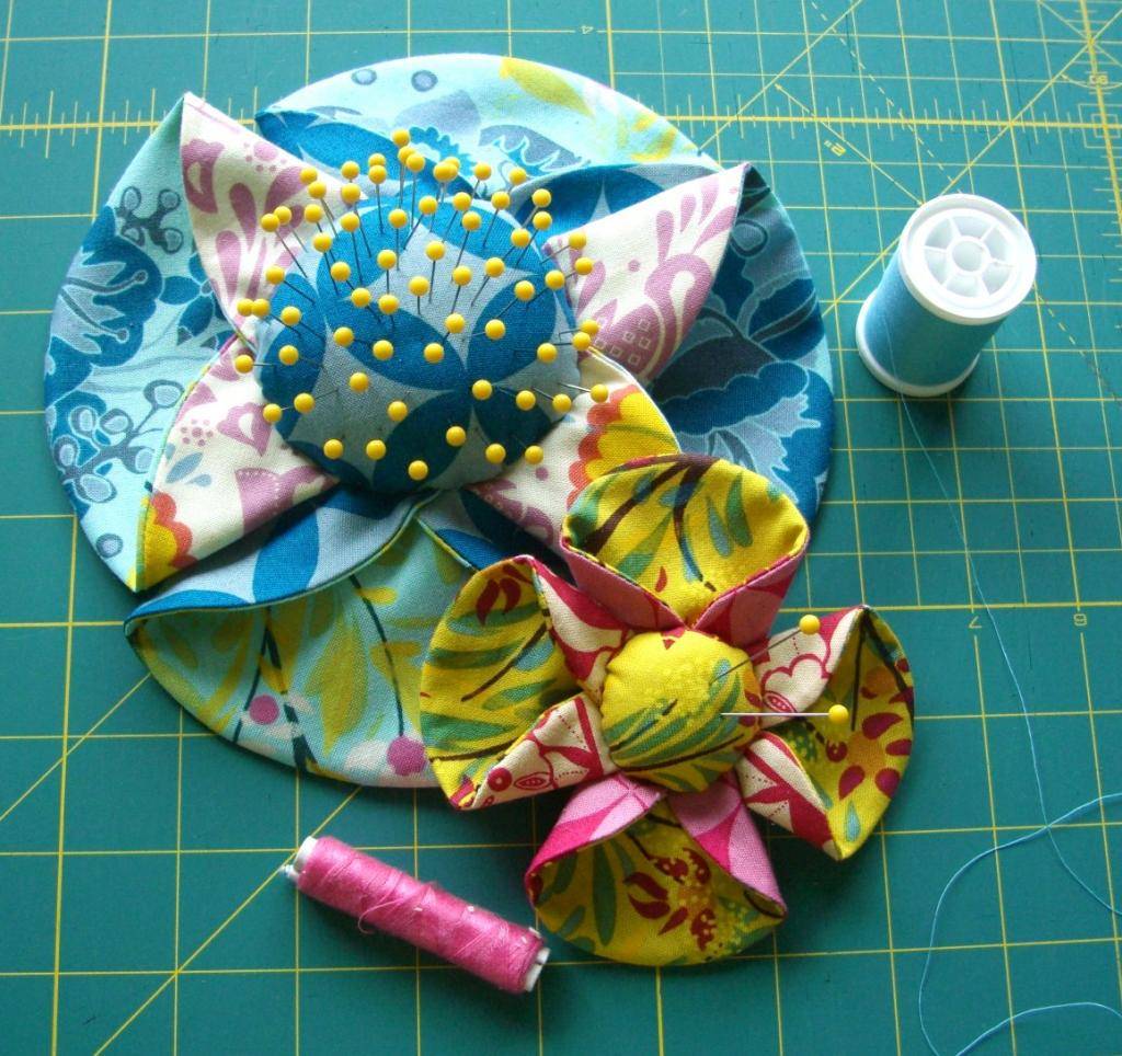 1. Вырезаем шаблон. Круг побольше — это центр, а поменьше — лепестки. И остается шаблон непонятной формы — это листва. ) 2. Подбираем ткани для цветка. Лепестков у нас будет 7 шт. Я люблю подбирать ткань так, чтобы она была одинаковая по цветовой гамме, но по тону и рисунку разная. Фантазируйте. Например, Вы решили сделать цветок красным, подберите ткань белую в красный горошек, красную в белый цветочек, просто светло-красную, можно даже бордовую добавить. А центр сделать, к примеру, оранжевым, ну или выбрать несколько цветов для центра и примерить к лепесткам какой больше подойдет. 3. Вырезаем по шаблонам детали цветка (см. рис. 2).