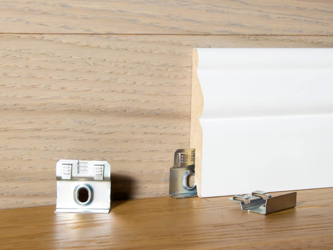 - Установочные клипсы. Применяются для крепления шпонированного или евро-плинуса из массива. Аналогичный метод укладки используется для плинтусов МДФ.