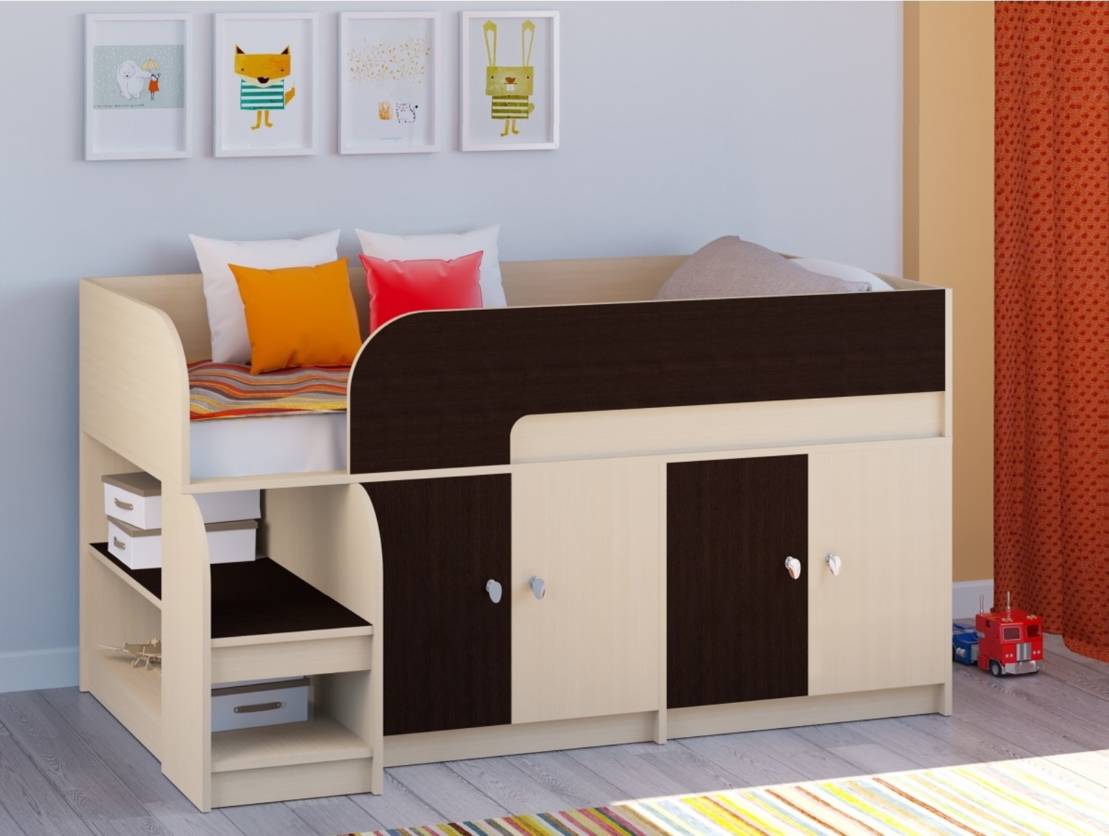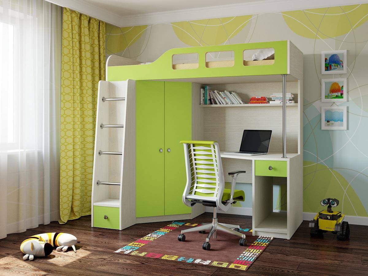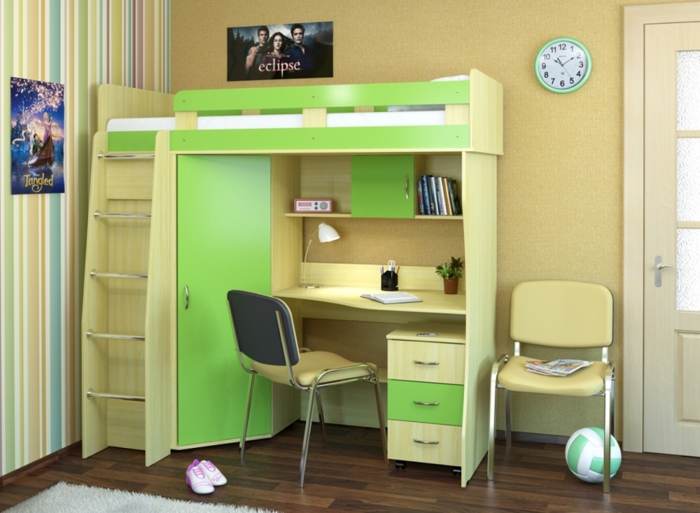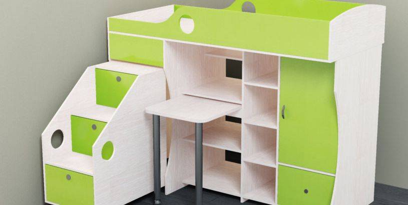 Также очень распространены варианты с рабочей зоной, которые различаются по высоте и местонахождению спального места. В последних современных моделях рабочее место находится на подиуме, а спальное – внизу. Выдвижные и угловые столы, стульчики, ящики, полки значительно экономят место.