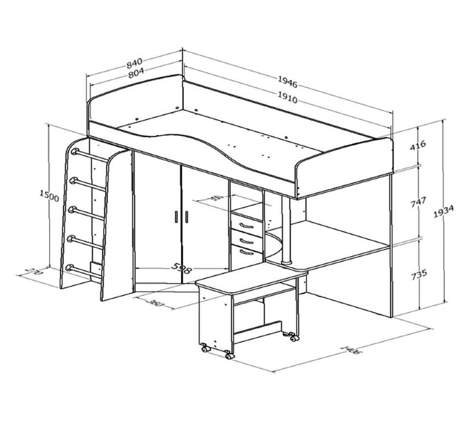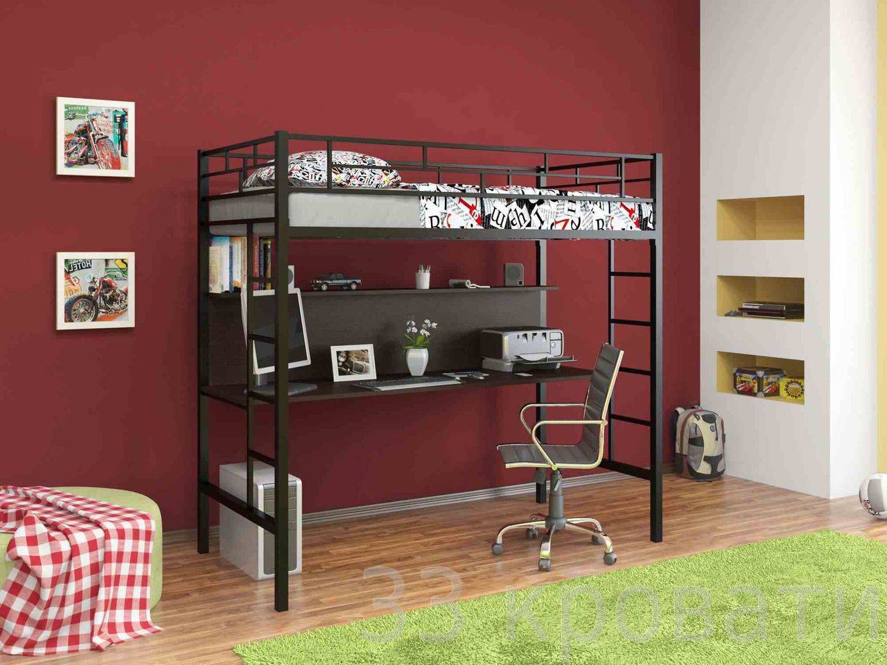 Кровать-чердак с рабочей зоной. В этом случае внизу есть стол с полками и ящиками для книг и других нужных вещей. Подойдет как для студентов и школьников, так и для тех, кто работает дома или же часто занимается делами в нерабочее время