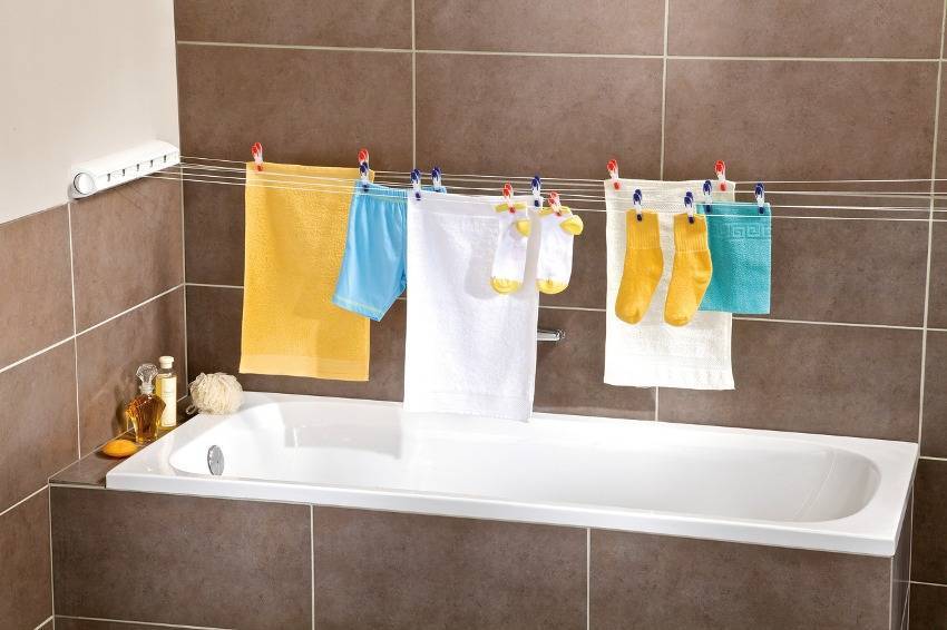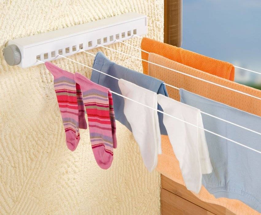 Очень удобными и популярными, особенно для небольшой квартиры, считаются настенные сушки для белья. Оригинальный и практичный вариант данного вида конструкций – это компактная складная сушилка для белья на стену. По своему строению такое приспособление напоминает те же бельевые веревки, но только более стильные и незаметные. На одну из стен вешается барабан с веревками, спрятанными внутри, а на другую – крепление. При необходимости веревки вытягиваются из барабана, а после сушки белья шнуры автоматически прячутся обратно.