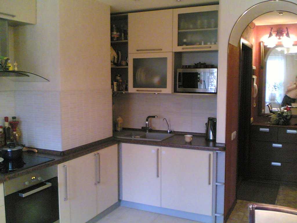 В таких помещениях обычно имеются ниши, пространства или выступы. В углубления стен прекрасно впишется встроенный шкаф–купе. В нем можно поместить кухонную утварь, бытовую технику.