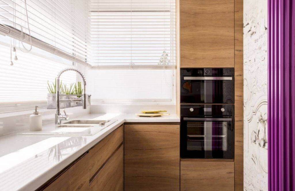 Маленькая квадратная кухня около 5 или 6 кв.м. – распространенный случай в типовых домах старой постройки времен СССР (хрущёвки, брежневки). Идеальной будет угловая планировка гарнитура. Это позволит разместить всю необходимую технику, оставить достаточно места для рабочей поверхности и сформировать правильный рабочий треугольник. Для рационального использования углового модуля установите в шкаф вращающиеся полки в виде карусели или выдвижные секции.