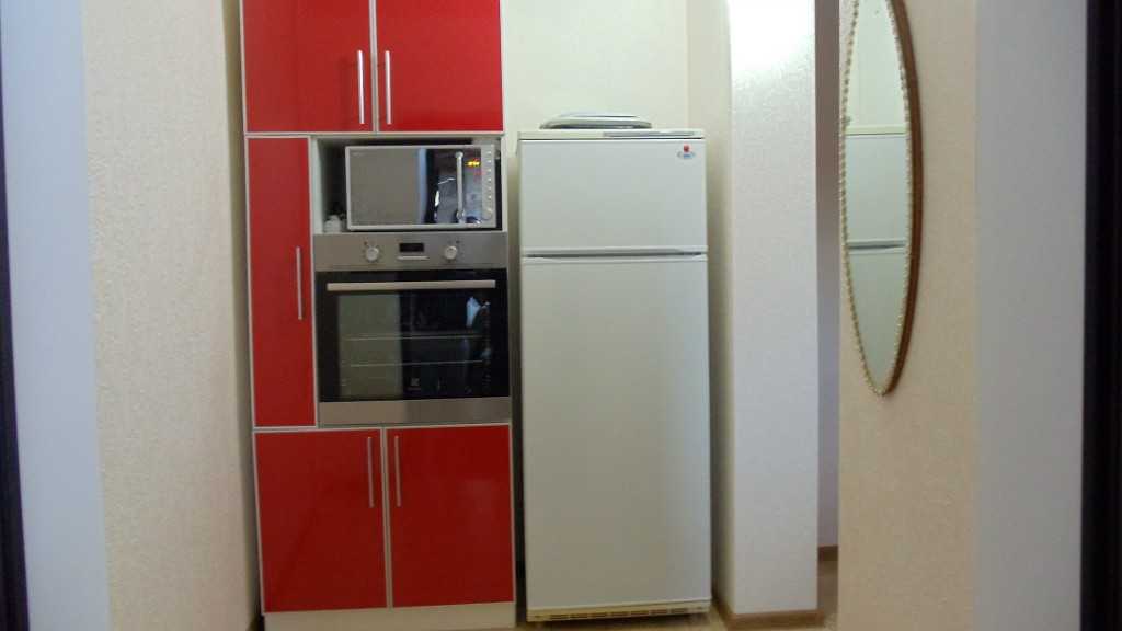 - На кухне можно организовать встроенную маленькую нишу, в которой удобно помещается холодильник. В таком варианте он не будет занимать свободное пространство, а для соблюдения кухонного интерьера можно его задекорировать при помощи раздвижных дверей или красивых шторок.
