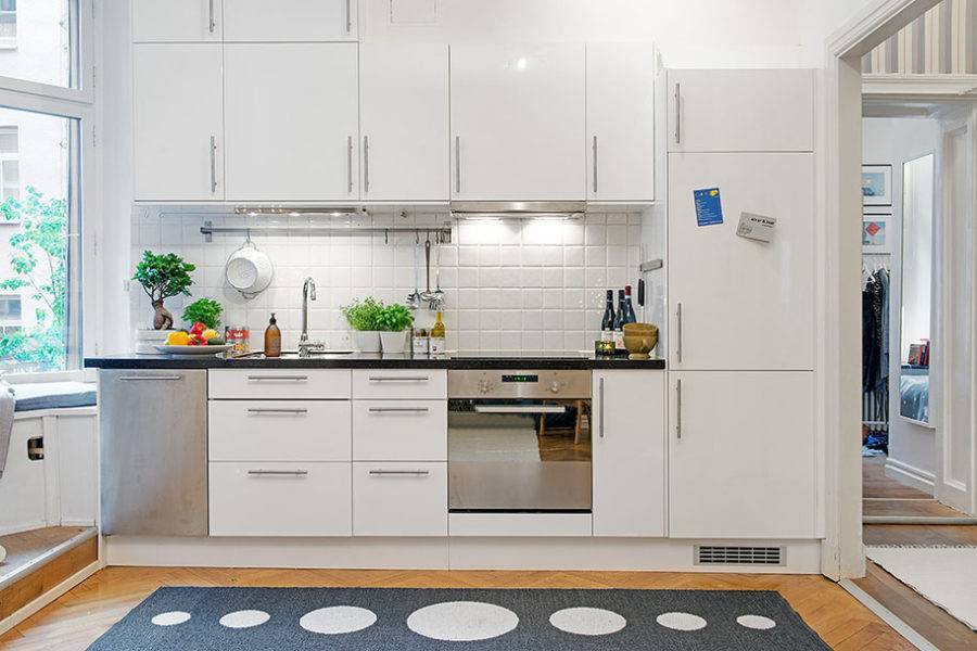 Почему вначале мы написали, что прямой кухонный гарнитур для маленькой кухни — наименее подходящий вариант? Все просто — мебелинемного, будет трудно уместить необходимую утварь и при этом постараться не лишить себя нужной бытовой техники.