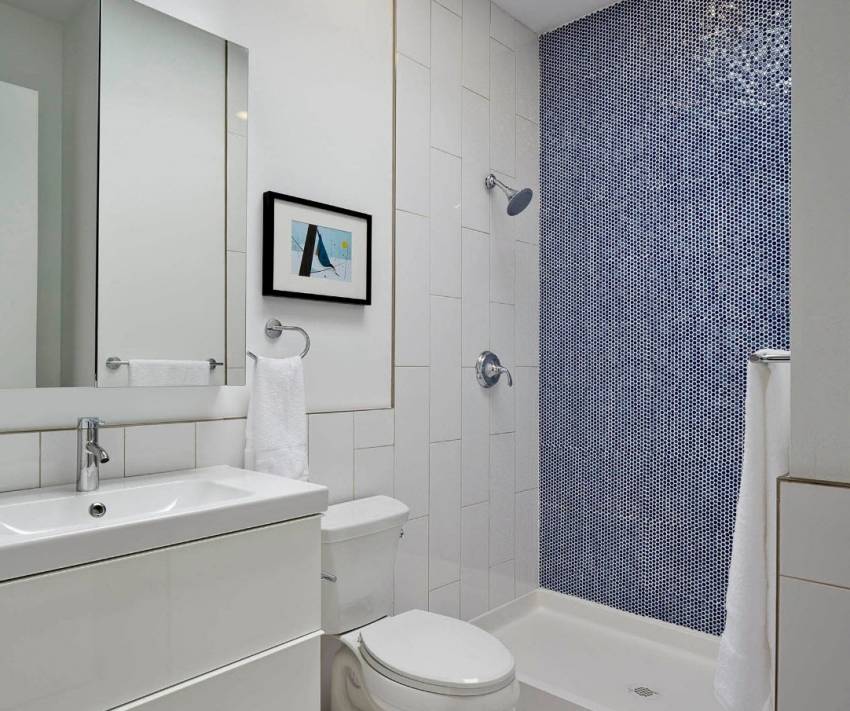 В случае очень маленькой ванной комнаты можете использовать эклектичные сочетания цветов и оттенков для разных стен. Например, плитка может быть белой и фиолетовой, белой и голубой, светло-розовой и коричневой.