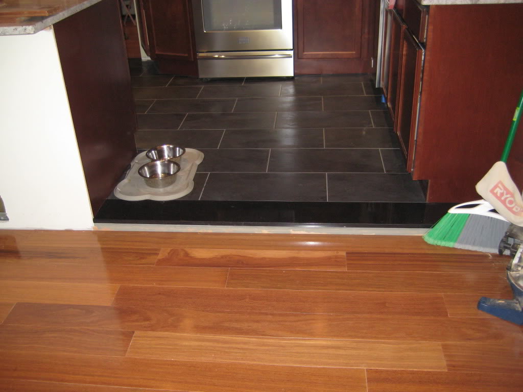 Стыковка двух напольных материалов на кухне, может быть выполнена, как по прямой, так и в виде, волны, изогнутой или ломаной линии. Например, для кухонного интерьера с преобладанием строгих геометрических форм, лучше если шов будет прямым, а в случае, если дизайн отличается волнистыми переходами или мебелью со сглаженными углами, будет уместно криволинейное соединение.