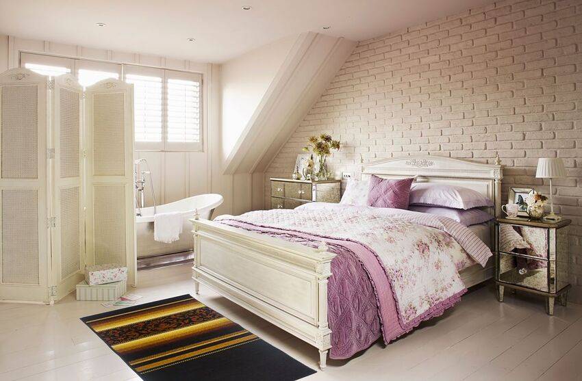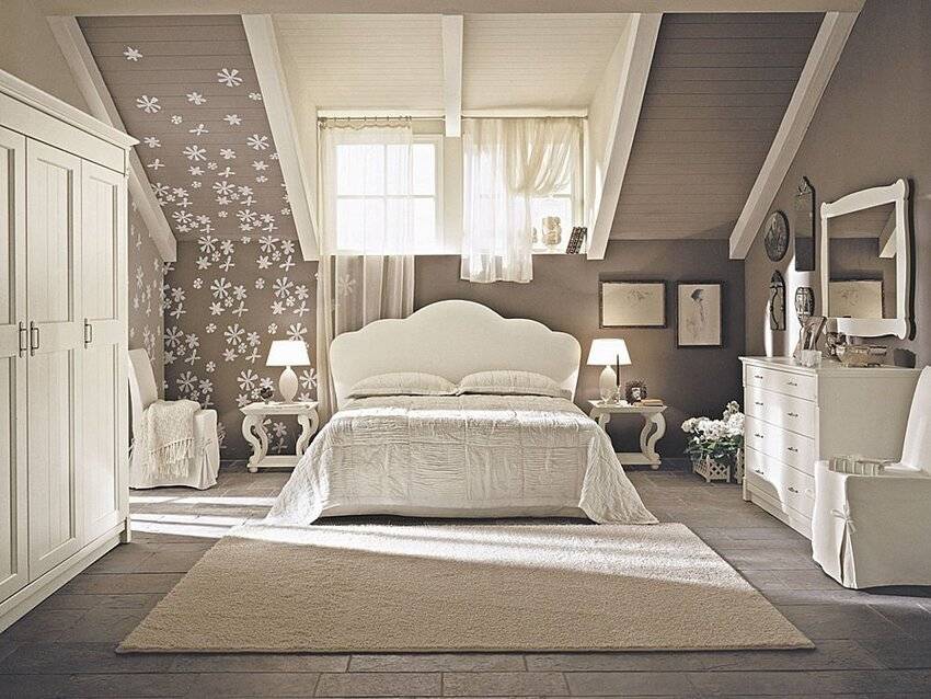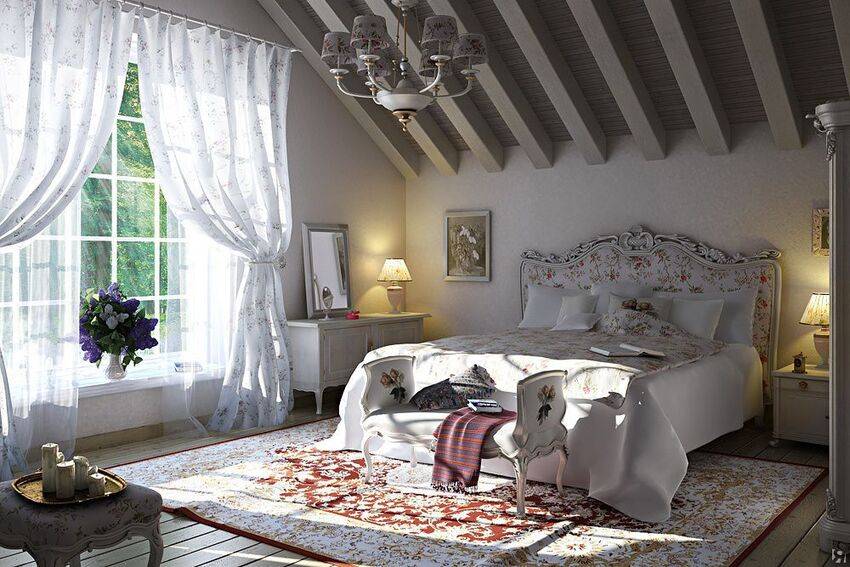 Мансарда – идеальное место для создания спальни в стиле прованс. В таком помещении обычно много больших окон и нет дорогой отделки.