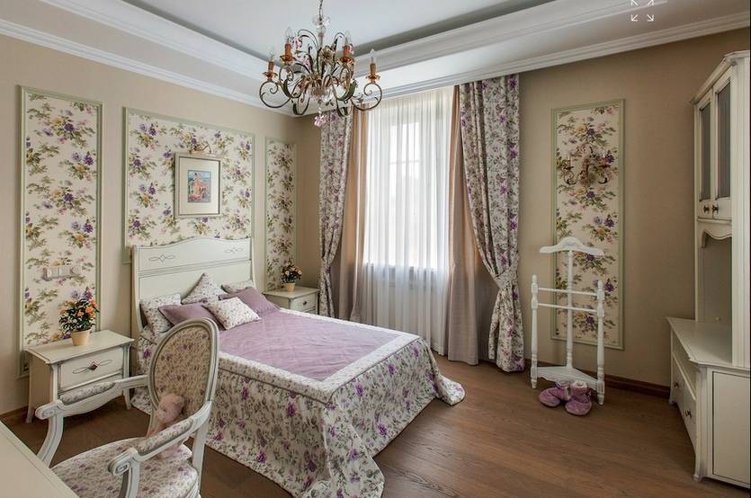 В отделке такой комнаты должны преобладать природные мотивы с изображением романтичных пейзажей. Они могут присутствовать на обоях, картинах, либо текстиле.