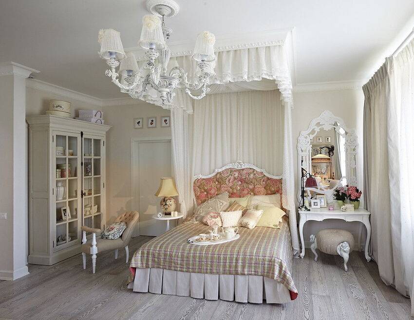 В такой спальне будет уместен балдахин над кроватью, изящные зеркала в форме ракушек, люстры с абажурами в виде цветов, картины с милыми кошками, или щенками на стенах.