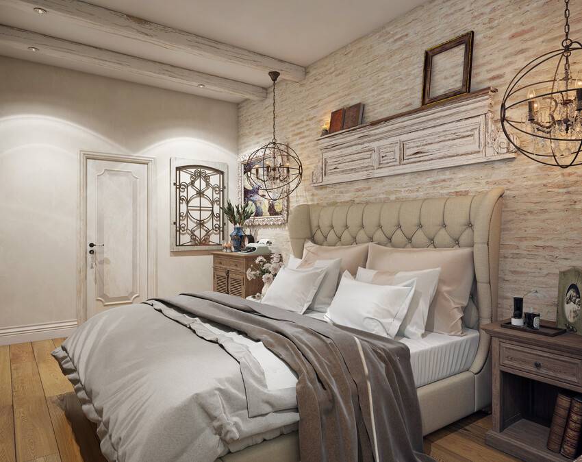 Мужской спальный прованс подразумевает минимальное количество декора. Такую комнату можно оформить в любых светлых оттенках, отделать спокойными обоями, штукатуркой, а также побелить.