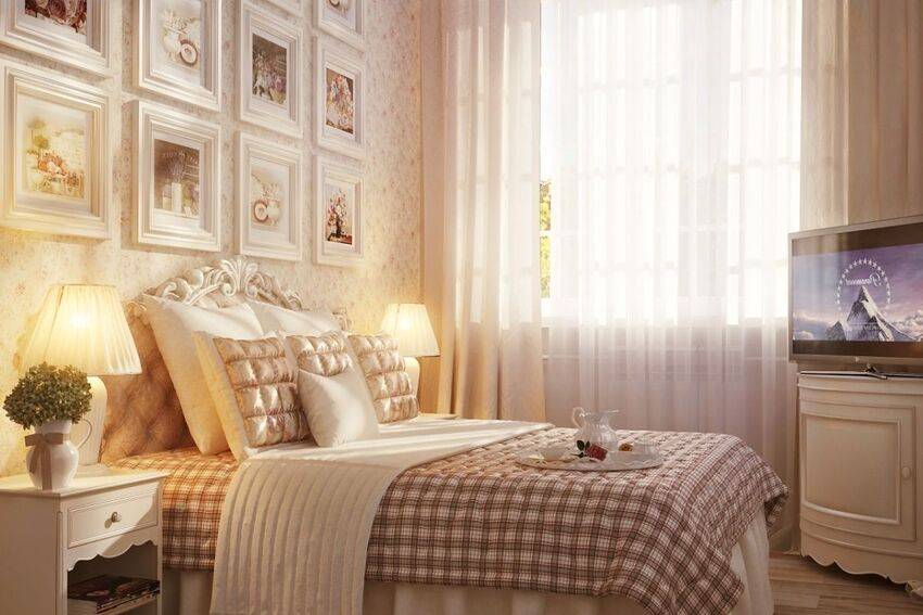 Спальни в хрущевке маленькие, и оформление их в стиле прованс нужно тщательно продумать. Стены можно оклеить обоями с изображением цветов, листьев. Если комната узкая, их лучше просто побелить. Это позволит визуально расширить пространство.
