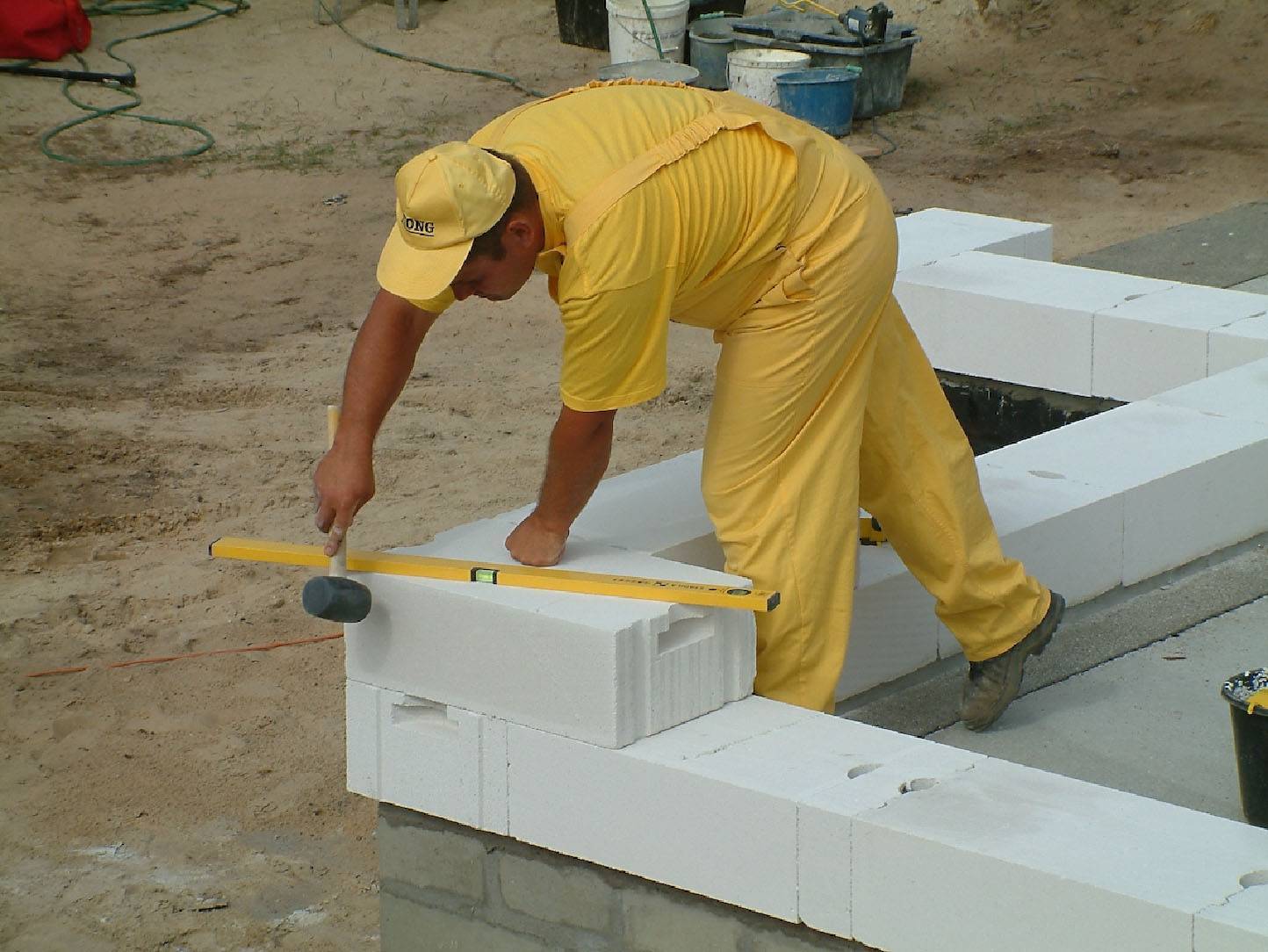 От качества кладки первого ряда газобетона зависит прочность и надежность стен. По углам фундамента устанавливаются блоки, которые будут служить маяками. Первый камень устанавливается в самой высокой точке. Между блоками протягивают шнуры для контроля укладываемого ряда. Горизонтальная и вертикальная плоскость элементов проверяются уровнем. Скорректировать расположение газобетонного блока помогает резиновая киянка.