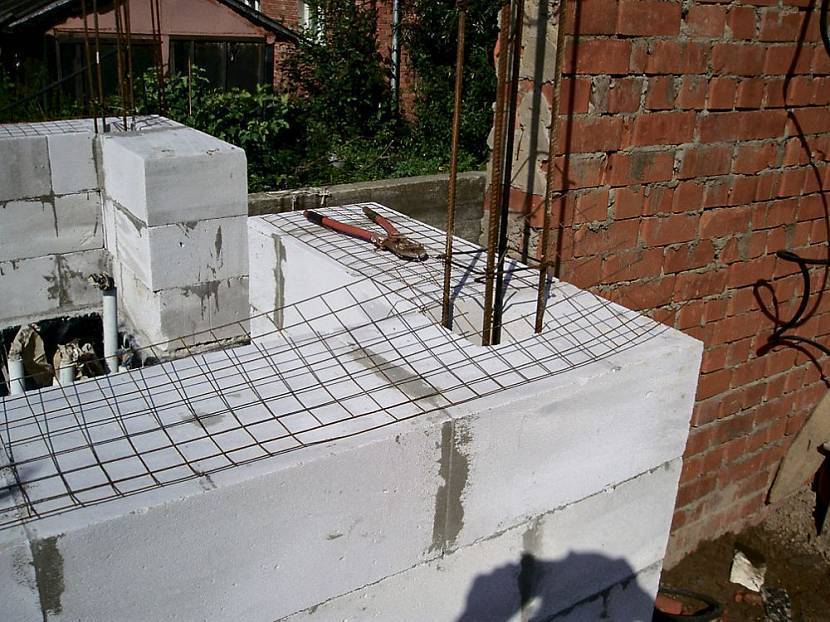 Внутрь их помещается каркас, связанный из прутков сечением 10-12 мм. Необходимо проследить, чтобы металл не касался газобетона. Для этого устанавливаются фиксаторы в форме звездочек.