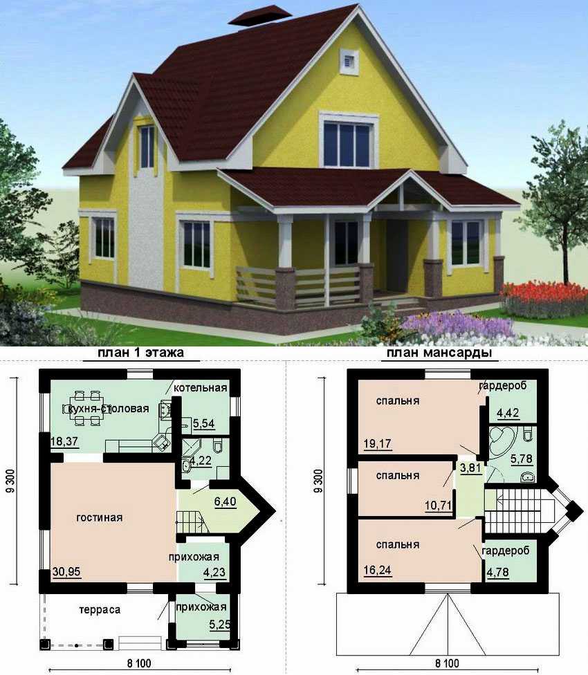 Проект небольшого одноэтажного дома с мансардой из газобетона.