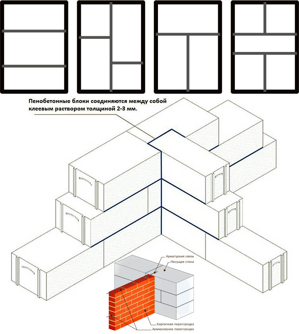 Взгляните на верхний ряд схем на рис. В проекте своего дома вы почти наверняка обнаружите перегородки, соответствующие какой-то из этих, наиболее распространенных, пространственных силовых схем домов из пеноблоков. Возводят такие перегородки одновременно со стенами, и врезают в них на 1/3 толщины стены, как показано посредине на рис. Способы разветвлений армирования швов, описанные выше, предназначены именно для силовых перегородок. В грамотно составленном проекте дома из пеноблоков обязательно указывается, какие перегородки нужно врезать в стены и армировать заодно с ними.