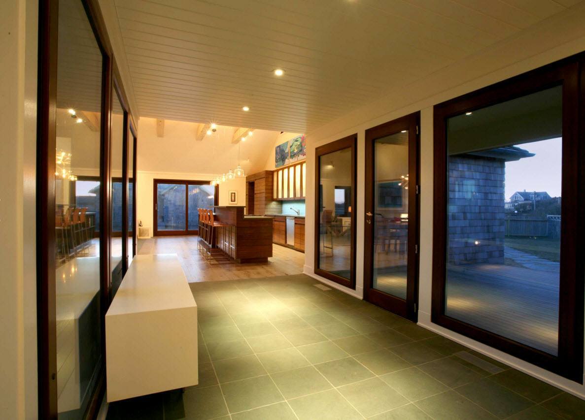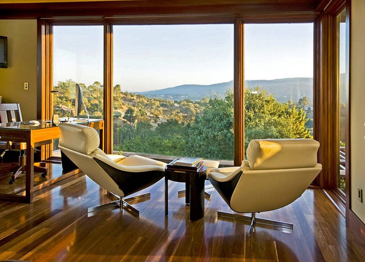 Особенно выигрышно смотрятся такие интерьеры в том случае, если из окна открывается красивый вид. Как правило, подобным образом остекляют большие квартиры в современных новостройках, особенно так называемые «видовые», выходящие окнами на лес, водоем, красивую городскую застройку. Применяется панорамное остекление и в частных домах, если это предусмотрено дизайн проектом дома.