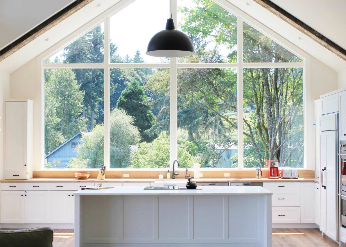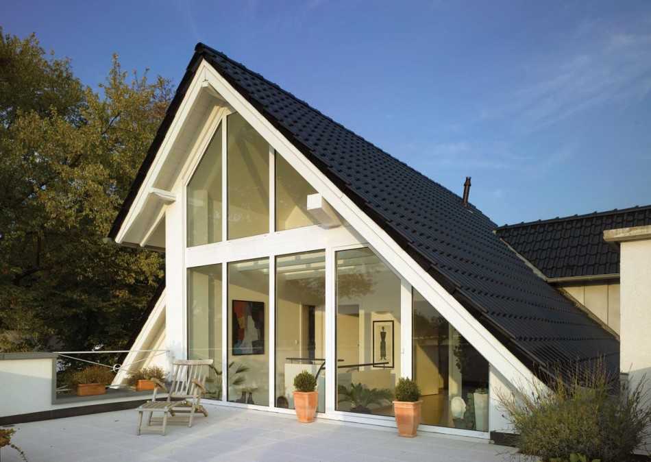 Окна, повторяющие форму стены, позволяют получить максимальную выгоду с точки зрения обеспечения пространства солнечным светом. Как правило, такие оконные проемы имеют треугольный или трапециевидный верх. Безусловно, изготовление подобных моделей окон обойдется дороже стандартных, но эта инвестиция быстро окупится, ведь подобные конструкции устанавливаются на долгие годы, а почувствовать преимущество обзорных окон над обычными вы сможете сразу же.