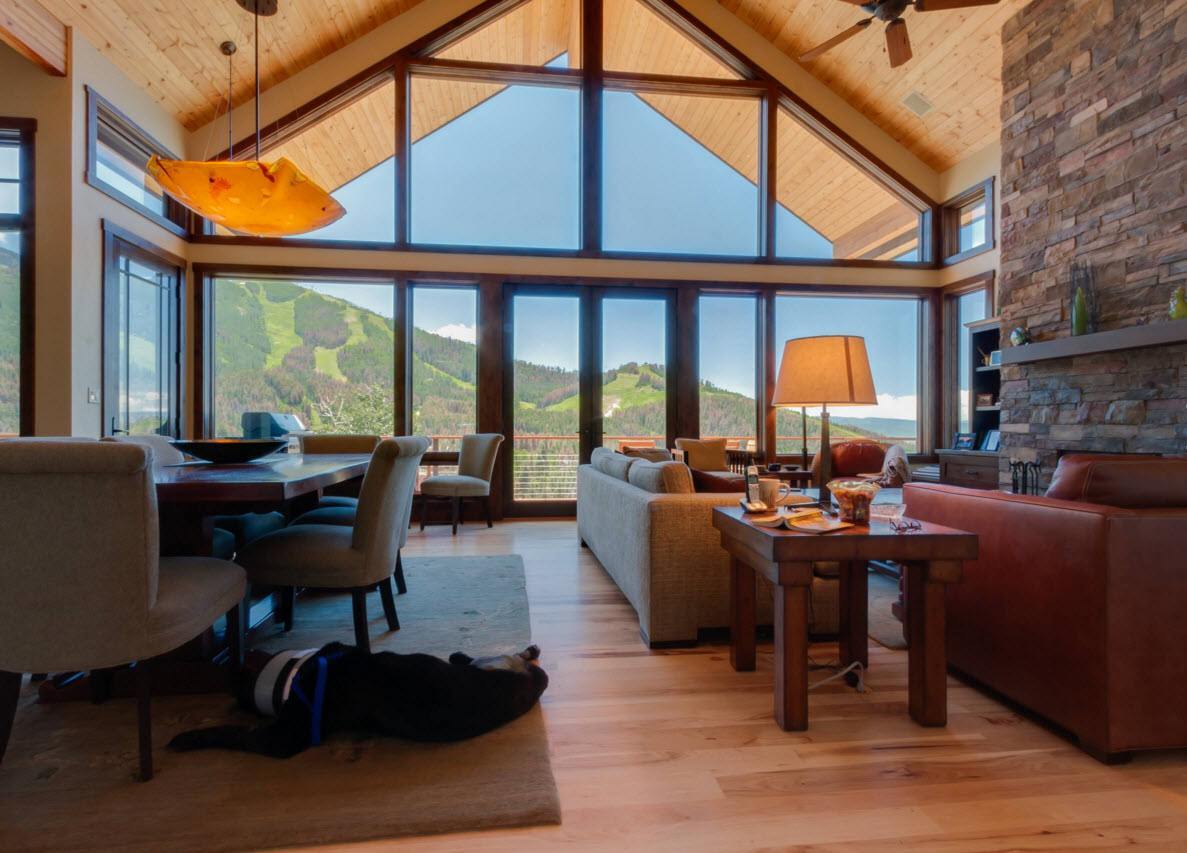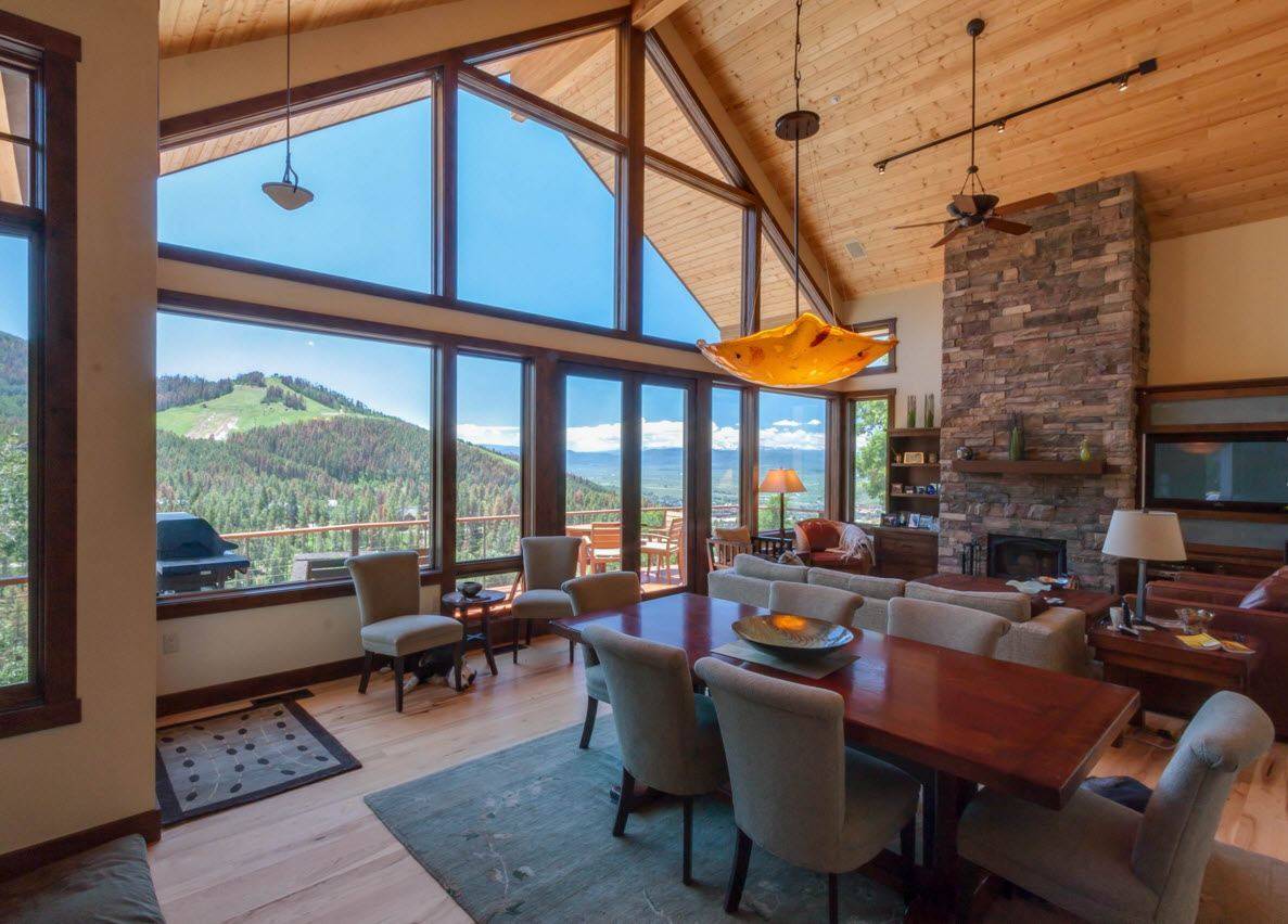 Аналогичная конструкция панорамных окон используется в загородных домах, выполненных в стиле шале. Когда за пределами жилища открывается шикарный вид на горы, упускать возможность наслаждаться красотой природы не хочется и использование максимально возможного пространства для застекления в этом случае – основной приоритет.