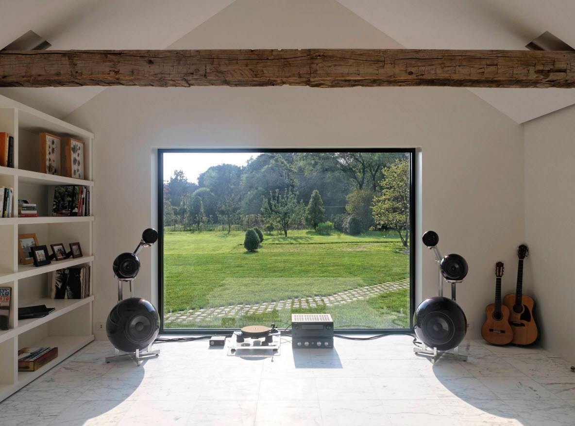 Неотъемлемым элементом интерьера гостиной считается телевизор и сопутствующая цифровая техника. Обычно ТВ располагают у окна, иногда для этой цели используют стену между двумя панорамными окнами, если такая стена имеется. Кроме того, в гостиной с большим окном можно расположить телескоп для наблюдения ночного неба, можно поставить рояль перед окном. В такой гостиной будет прекрасная атмосфера для исполнителя музыки и его слушателей.