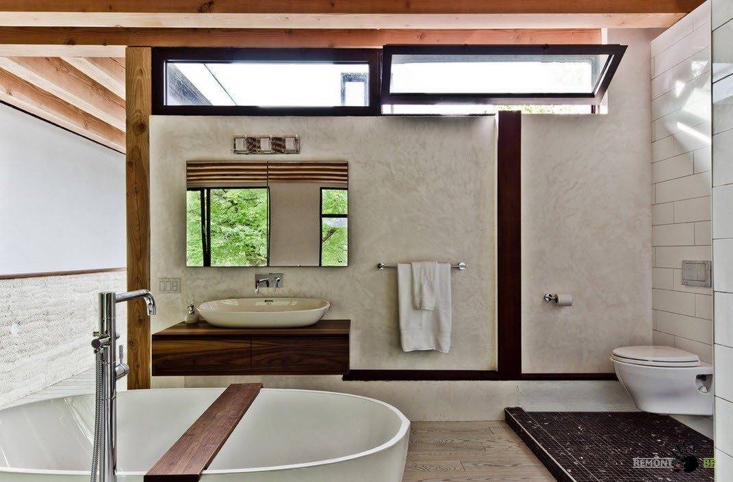В частных домах пространства ванных комнат могут похвастать внушительными размерами, в отличие от своих городских собратьев, заключенных в рамки городских стандартных квартир. И следствием этого является, прежде всего, возможность в принципе установить окно, а иногда не одно, и совсем немаленькое.