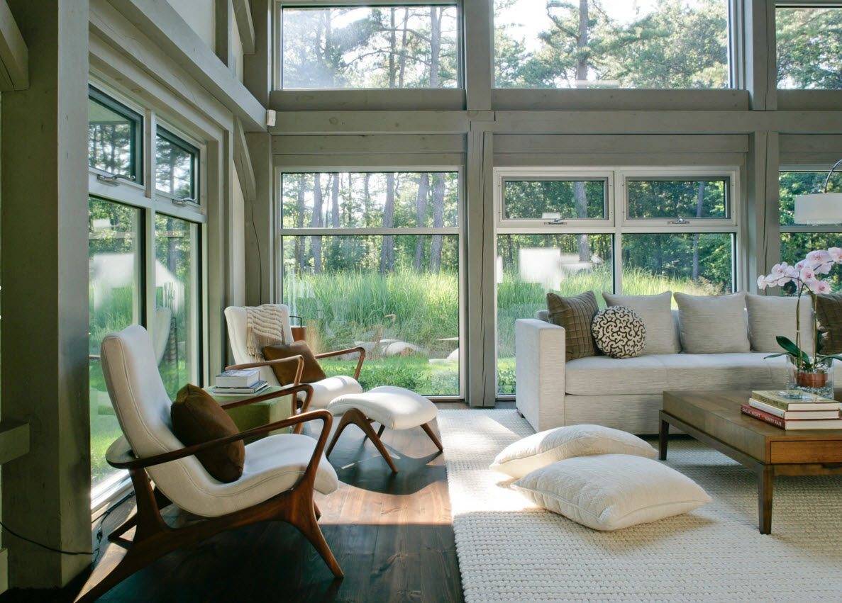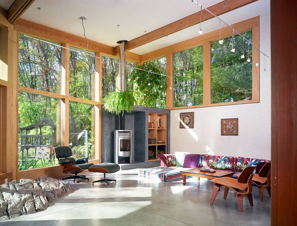 Если панорамное остекление в доме имеет только одна сторона гостиной, то в ней можно выделить несколько зон для отдыха. В этом случае одна область может быть обустроена возле камина, а другая, недалеко от больших окон. Здесь можно расположить уютное кресло, на котором удобно предаваться раздумьям, любуясь на живописный сад; журнальный столик, а также подвесной гамак, предназначенный для комфортного отдыха.