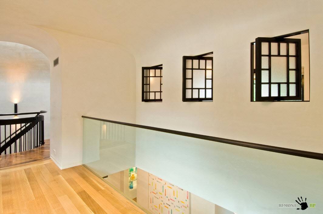 Поворотные окна в темной контрастной раме служат не только в качестве источника света и свежего воздуха, но и элемента декора помещения, успешно гармонирую я отделкой лестницы.