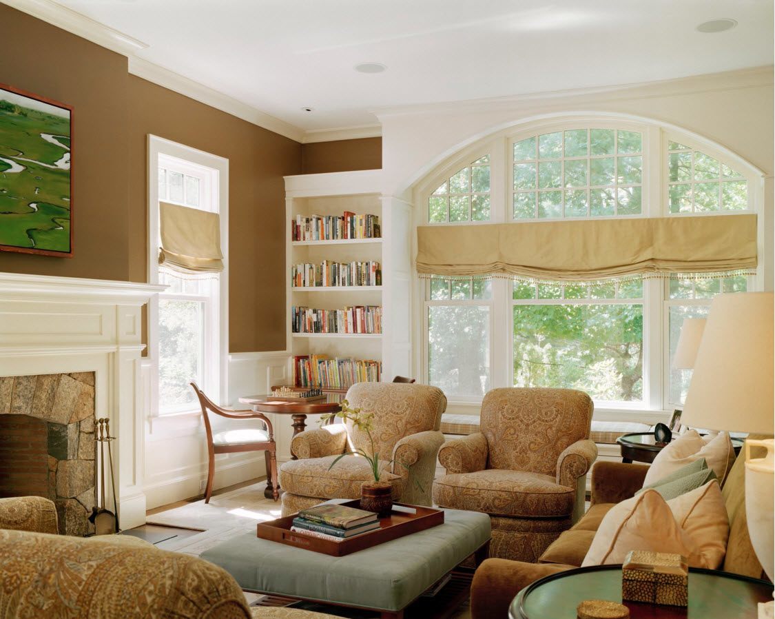 Большие арочные окна отлично подходят для помещений с высокими потолками. Интерьер гостиной с таким дизайном окна будет выглядеть органично, если сложится по традиционному пути оформления помещений, ближе к классической стилистике.