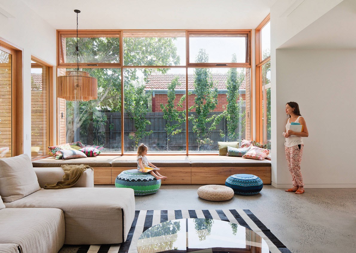 | Панорамное остекление позволяет хорошо освещать помещение естественным светом до самого заката. | Расположение стекла прямо над полом может стать дополнительным источником опасности для маленьких детей. Неловкое движение, удачный гол мячиком или просто падение какого-то предмета могут привести к серьёзным травмам. Предусмотрительные хозяева устанавливают перед такими окнами специальные ограждения. |