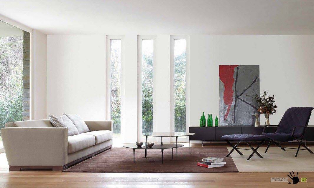 - В таком дизайне не принято использовать шторы или портьеры. Единственное, что допустимо – повесить занавески, закрепленные по краям рамы.