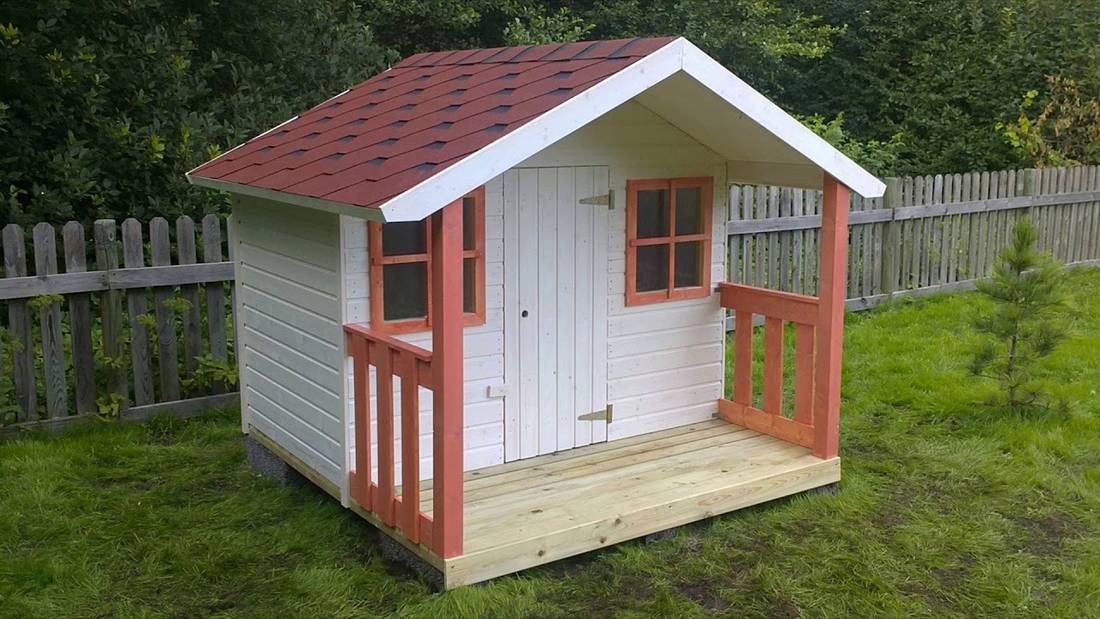 Наиболее простую конструкцию домика можно собрать из деревянного каркаса, обшитого вагонкой или блок-хаусом. Такой вариант подкупает своей простотой и легкостью сборки. Но устанавливать конструкцию лучше не на голую землю, а на специально подготовленный настил. Для этого по периметру сооружения необходимо залить бетонные основания и установить на них деревянную раму. Учитывая, что кроме внутренней игровой зоны в строении полезно предусмотреть и открытую веранду, рекомендованный размер сооружения должен составлять не менее двух с половиной на полтора метра.