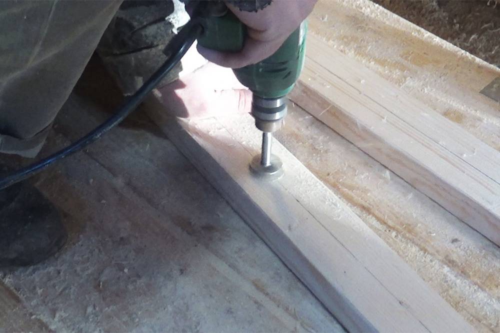 А такой коронкой высверливал «шишки» на брусе. Я не стал использовать тиски, так как останутся вмятины на древесине, решил просто крепко держать брус в руках
