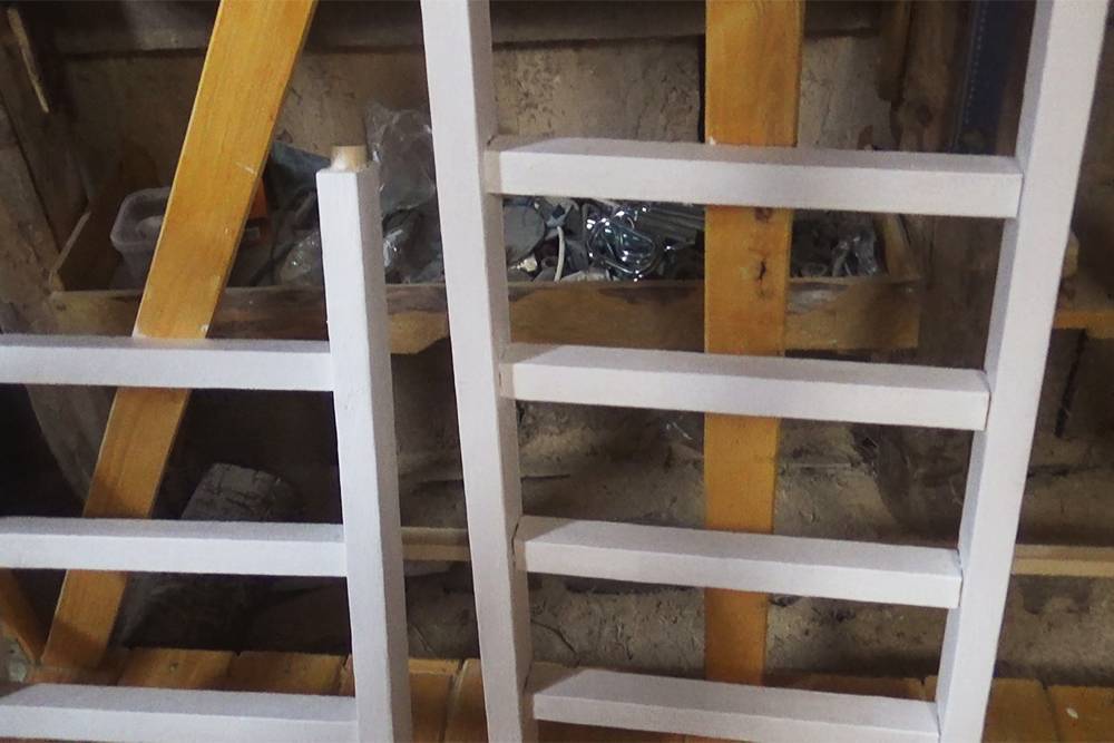 Обязательно сделайте лестницу. Для этого нужно вырезать две вертикальные, закругленные сверху детали. Соединить их тремя горизонтальными ступенями.