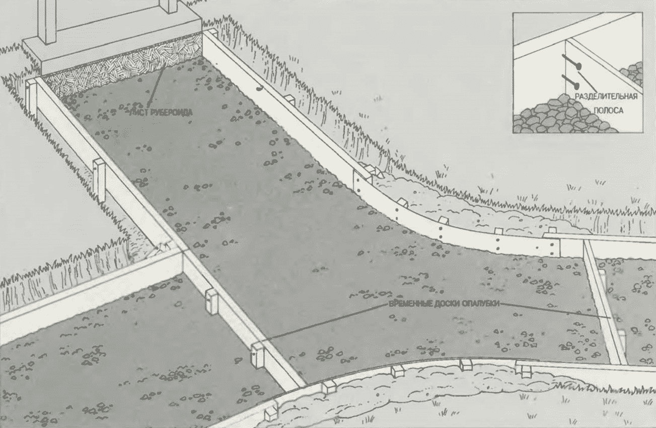 Отрежьте полосы упругого материала (обычно это рубероид) шириной 100 мм и длиной, равной ширине дорожки, и поместите их во всех местах, где бетон будет соприкасаться с существующими конструкциями.