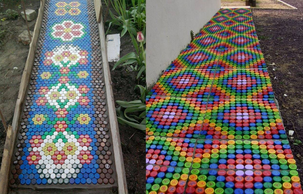 Нестандартными вариантами для украшения участка станут дорожки из крышек пластиковых бутылок. Процесс укладки во многом схож с кирпичом. Лишь заранее нужно собрать детали на леску или супер клей, выбрав понравившиеся сочетание цветов. Смотрятся такие мостовые, как мозаика. Яркий ковровый узор подойдёт для маленьких вставок в бетон у сарая или на детской площадке.