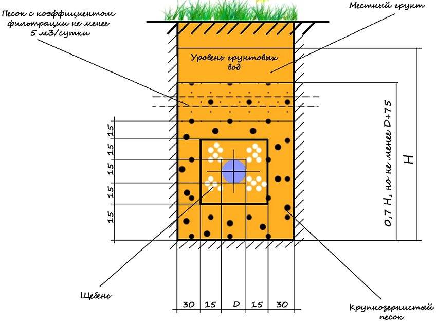 Для участков с глинами или суглинками требуется создание вокруг трубы фильтрующего слоя засыпки из песка и гравия, иначе обмотка быстро пропитается жидкой глиной и перестанет пропускать воду.