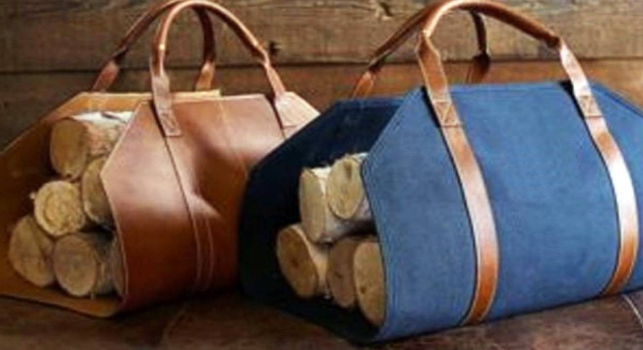Если полотнища украсить вставками из цветного материала, орнаментом, то такая сумка-дровница будет еще и украшением интерьера.