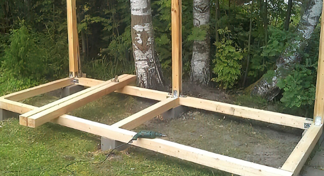 Каркас сделан из бруса — стойки, нижняя и верхняя обвязка сделаны из бруса 100*100 мм. Брус предварительно пропитан отработанным машинным маслом. Собиралось все встык, гвоздями, усиливалось уголками на шурупах. Для опор куплены стандартные мелкие фундаментные блоки 200*200*600 мм в количестве 6 штук.