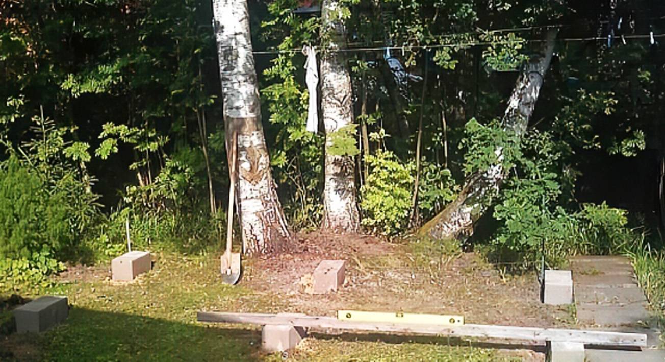 Начало строительства дровника стандартное — выравнивание площадки и выставление по уровню блоков. Если грунты вязкие (глина суглинки, чернозем), лучше делать песчано-гравийную подушку. Выкопать небольшие котлованы 20-25 см глубины, насыпать и утрамбовать щебень, сверху установить блоки.