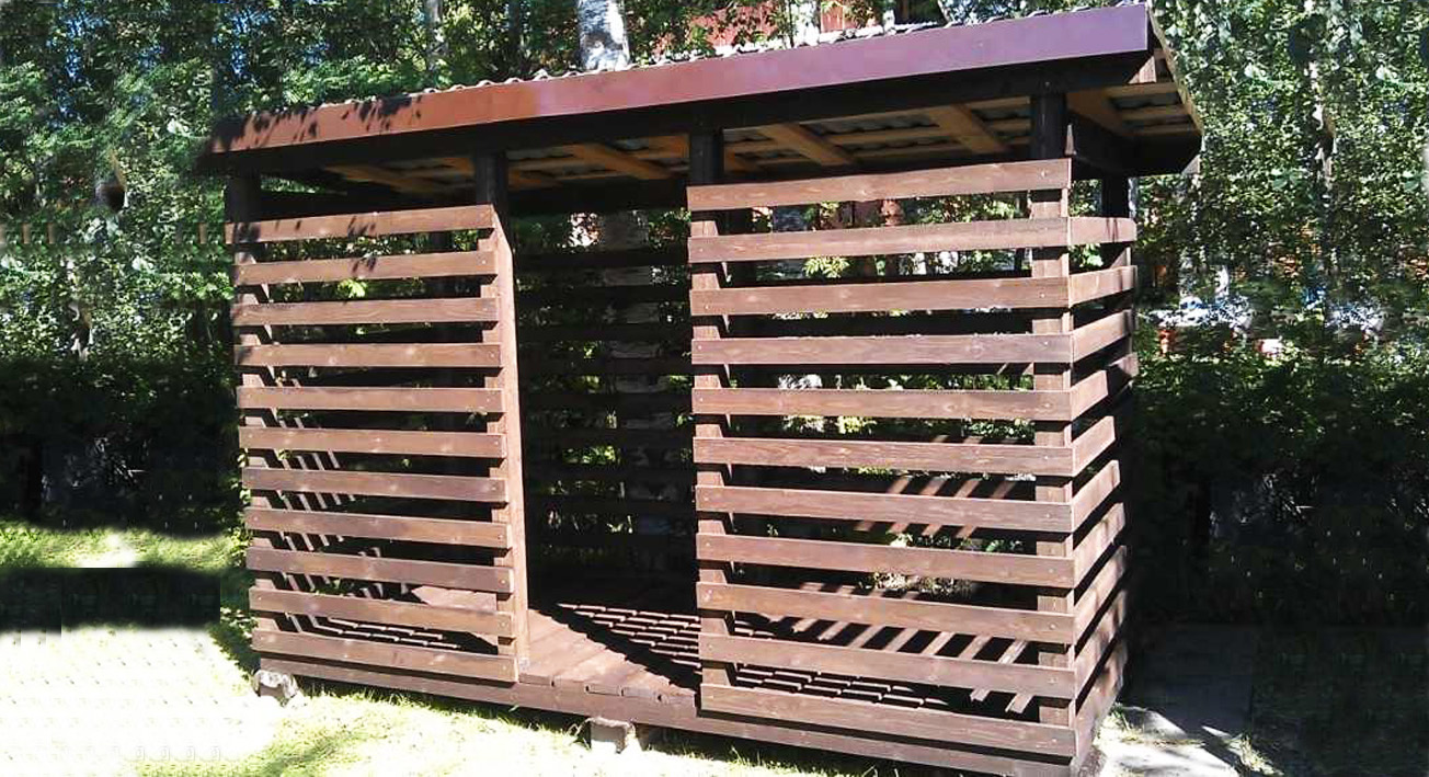 Важно, чтобы они не были глухими, имели щели для движения воздуха, но в то же время защищали строение от плохих погодных условий. Иногда поленницы похожи на беседки. Для большого количества дров выстраивают длинные секционные строения