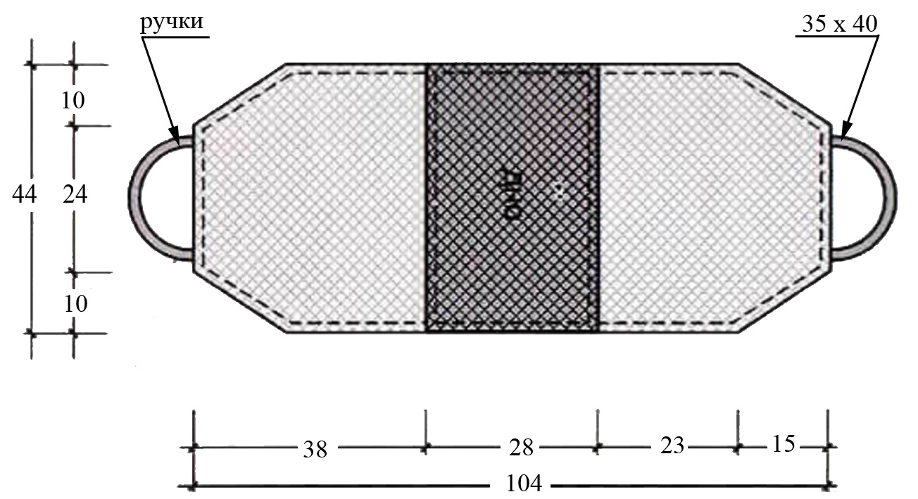 - Лента корсажная 35х4 см. (2 шт.) для ручек и 2 шт. по 104 см. для полотна.