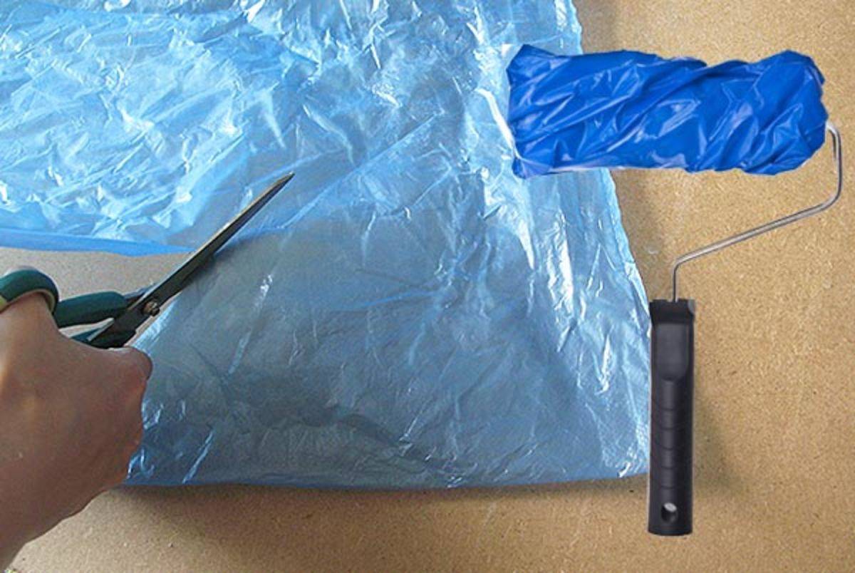 - Обмотайте валик пищевой пленкой. Рисунок получится спонтанным и хаотичным.
