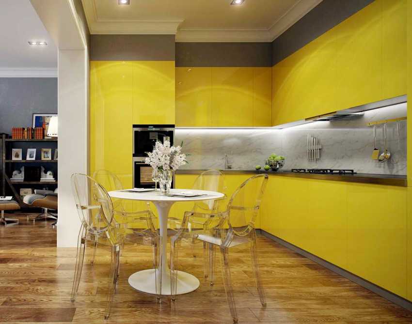 Глянцевый стеклянный фартук смотрится достаточно стильно. Но также требует и максимум ухода