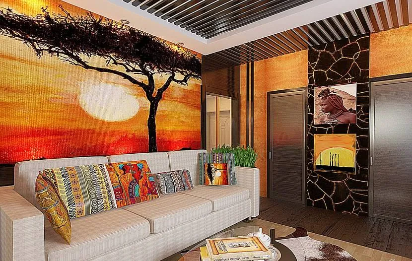 - африканский стиль может быть украшен фресками с изображением саванн, диких животных, аутентичной посуды, девушек. Также отлично смотрятся характерные орнаменты;
