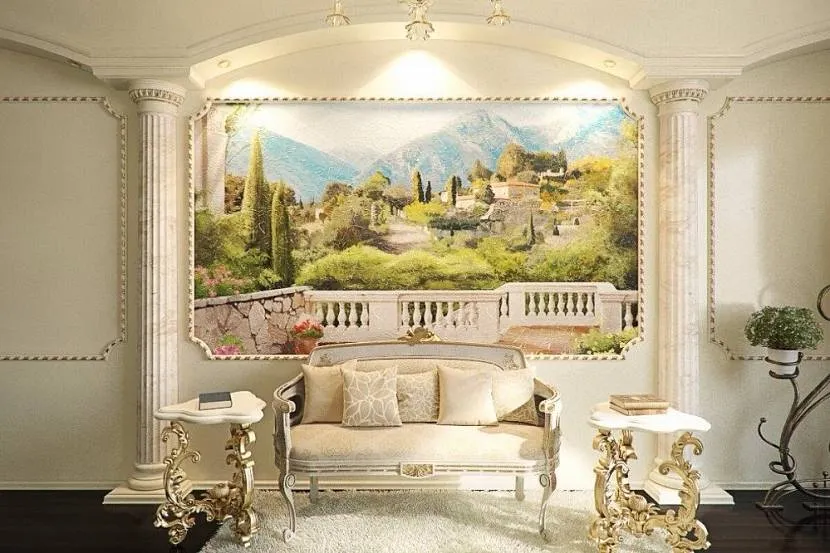 - для украшения различных архитектурных деталей, например, ниш, выступов, колонн. При правильном подборе изображения можно добиться невероятных эффектов. Например, при изображении в нише распахнутых дверей балкона с видом на море можно создать ощущение, что квартира, в самом деле, расположена на берегу.