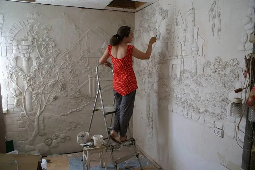 - зонирование. Фреской можно украсить только часть стены, отделяя одну зону от другой. Допустим, стены в совмещенной кухне-гостиной оштукатурены. Одну из стен в гостиной можно украсить фреской. И тогда уж точно никаких стен не понадобится, чтобы провести черту между разными зонами;