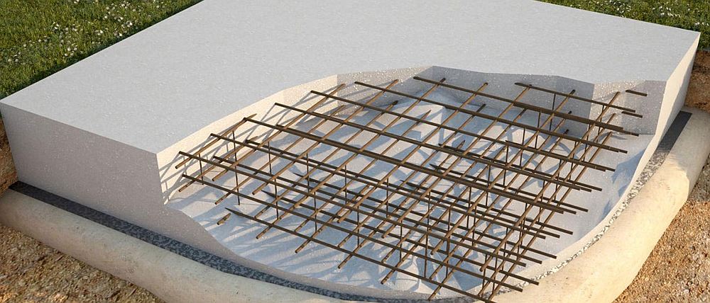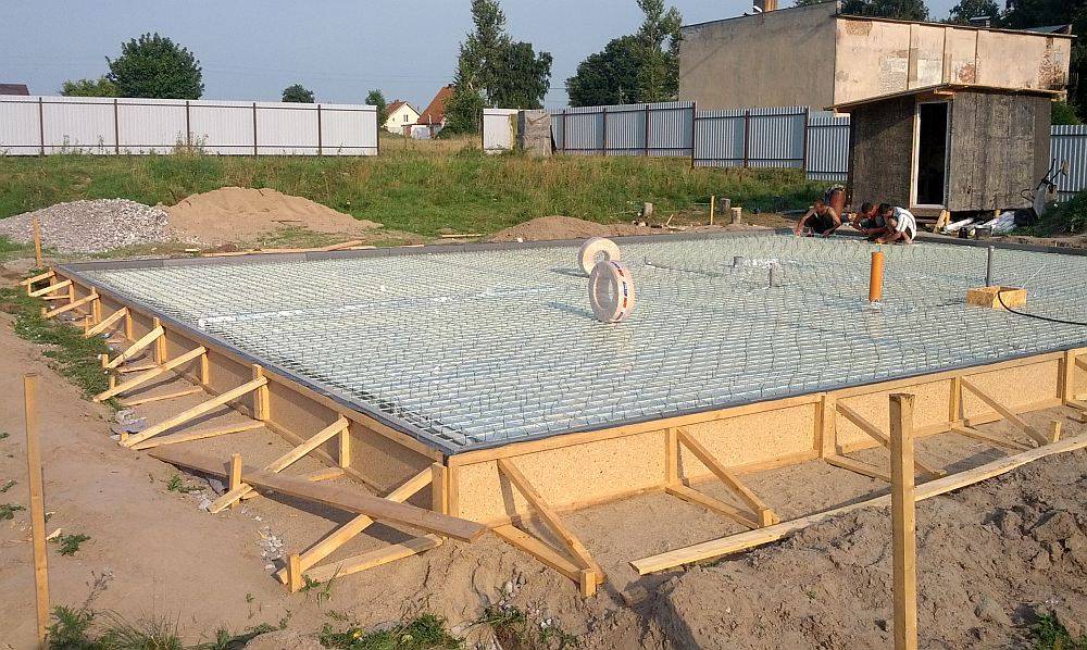 Поскольку железобетонное основание занимает ту же площадь, что и строение, вес последнего равномерно распределяется по всей поверхности. Благодаря этому, а также за счёт малой степени заглубления, фундамент подходит для строительства на слабых почвах: