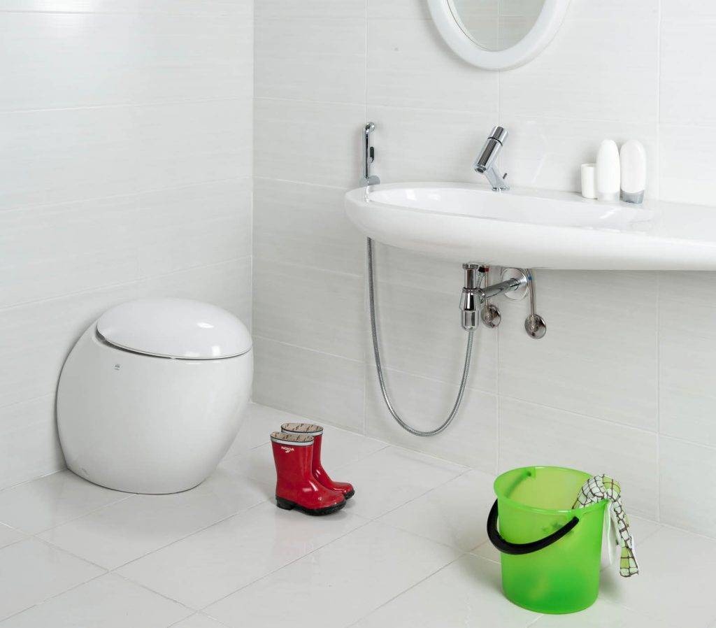 - Он идеально подходит для совмещенных санузлов, где одновременно установлены раковина и унитаз. Причем между ними должно быть небольшое расстояние, чтобы было достаточно шланга смесителя.