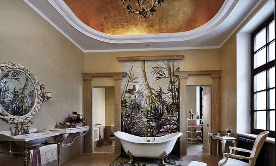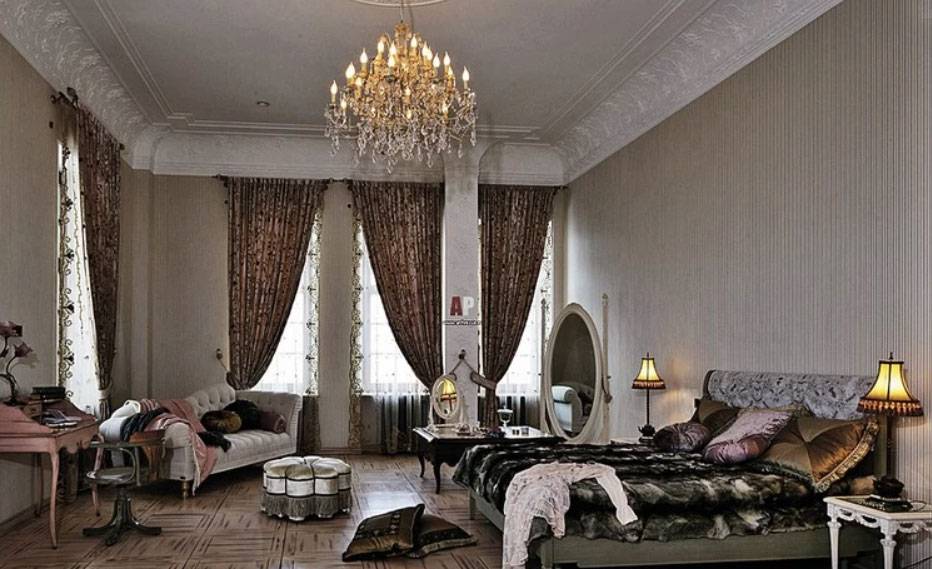 Изысканность интерьера подчеркивается антикварной мебелью, дорогими люстрами и лепниной на стенах и потолке.