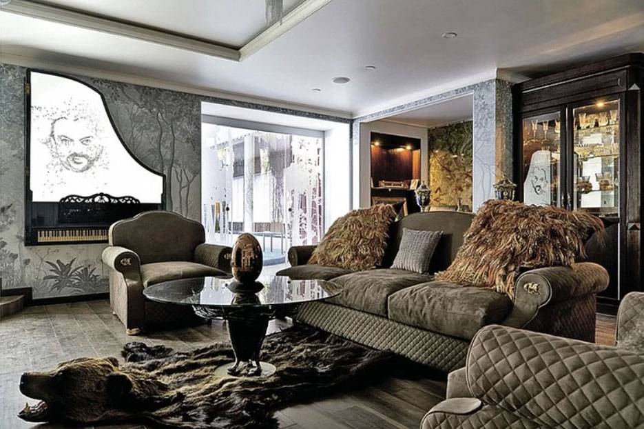Особняк площадью четыре тысячи квадратных метров был построен с размахом. Его обустройством и занимались самые именитые дизайнеры. Не только потолки, но и стены украшает оригинальная лепнина тонкой работы. С потолка свисают огромные многоярусные хрустальные люстры. А от удивительной красоты мраморного пола, эксклюзивной мебели ручной работы из карельской березы и красного дерева и наличия антиквариата кружится голова.